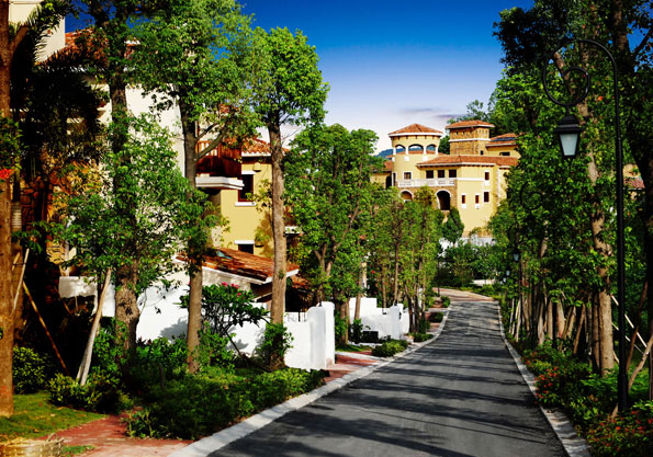 项目巧妙利用三条空间景观轴线,巧妙结合林荫大道、森林公园、无边际山顶泳池等进行超前规划。届时将全面建成功能齐备、配套完善、低密度和高标准的自然生态居住区,也将是深圳稀缺的纯粹山地特色的西班牙风情小镇。空间的立面处理,强调的对称平衡,穿透和最大限度的引入室外的自然园林,庭院的意韵设计,都前后连贯。