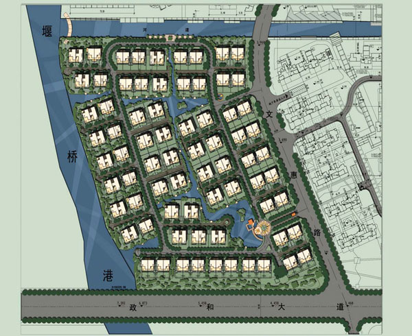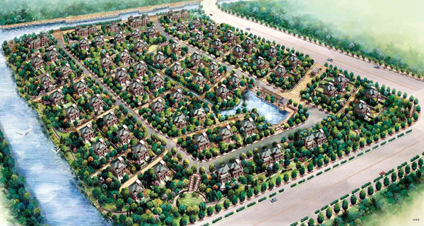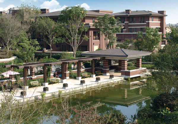 复地澜湾采用赖特在空间中著名的十字形平面布局,通过低矮稳重的建筑形态与院落、围墙、照壁等建筑方式,将北美大草原的的热情奔放和东方的含蓄内敛,兼容并蓄。建筑之间采用百米以上楼间距,用大量的条窗设计控制室内的光线效果,保护居住隐私,同时以多维度视觉实现宽广的景观视野。屋顶用极具北美田园风貌的大挑檐缓坡造型配以古典的烟囱装饰,以赖特大师的方式展示建筑美感和对生活的信赖。在墙体立面上采用红褐色砖墙贴面,接近大自然泥土和秋叶的柔和、温暖、乐观;局部采用石膏涂料,凹凸的线条与质感,形成丰富的墙面肌理。围墙影壁、入户栅栏、装饰花窗、阳台栏杆多处铁艺装饰设计,从枝叶、花蔓、细致的线条贴近自然的脉动;用自然中的几何体艺术将永恒的生命力凝固成建筑的一部分。