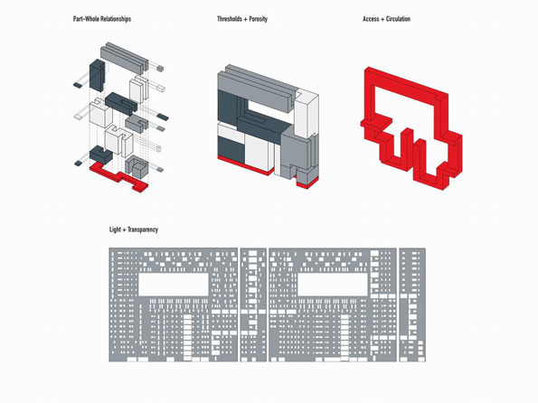 内,建筑内部空间公共性的强弱也就通过立面上开敞性的大小得到反应,形成虚实对比;另外,半室外的公共空间向建筑内部引入了大量光线,超越了传统平面街区狭长灰暗的街道体验。