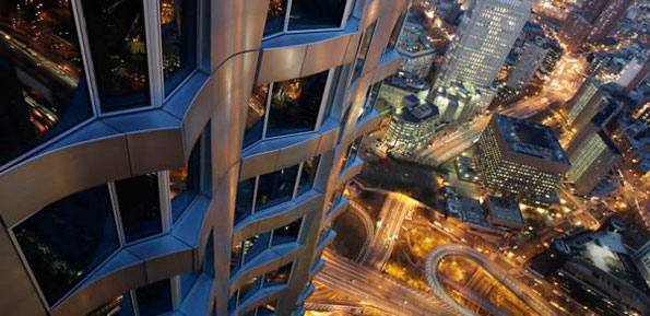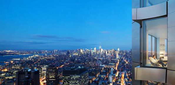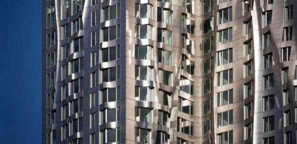 若你恰好位于布鲁克林海滨,会发现比克曼大厦的独特魅力——建筑的轮廓线随楼层升高逐渐后退,仿佛随时都会失去平衡。白天,充满褶皱的外墙犹如水流蚀刻而成,与南面的上世纪80年代玻璃塔形成了强烈的反差。在市政厅公园近看,浮现在波状表面上的层层“涟漪”显得更为柔和,犹如衣角的浅浅折痕。“后退型轮廓线是纽约摩天楼的一大特色。