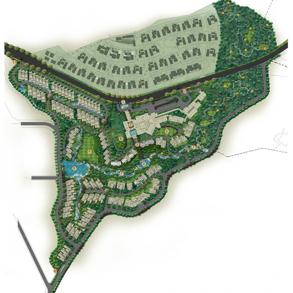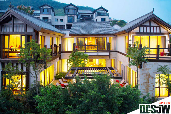 景观设计沿袭了悦榕庄营造优雅浪漫的度假风格,同时融入原生态的文化元素。风格采用巴蜀文化中的吊脚楼设计元素,结合现代设计手法,营造清幽又豪华的气氛。大量取材当地竹子,藏奢华于隐处,将整个巴渝建筑风格的酒店掩映在廊桥翠竹之中。