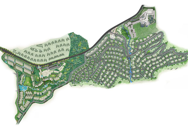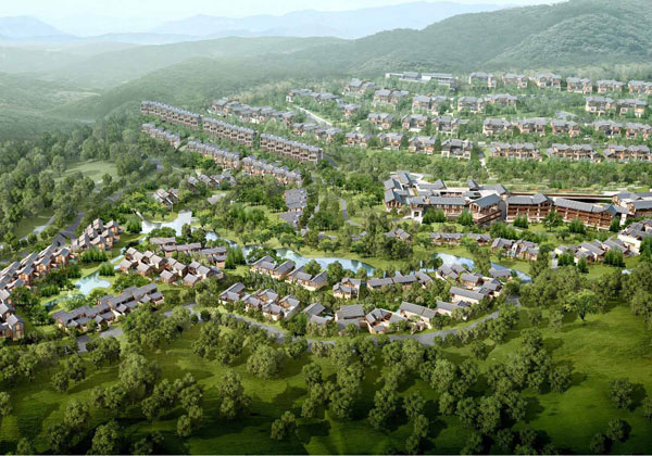度假村坐落于素有“重庆后花园”之称的北碚区,倚靠着国家级自然保护区缙云山,由新加坡悦榕控股集团规划设计,有悦榕、悦椿2个酒店以及独栋、双拼别墅和部分公寓组成,拥有48间精致的温泉套房及59间温泉别墅,设计采用了民国初期建筑风格及最具重庆特色的多层民居吊脚楼,开放的竹林庭院和门厅将度假村与自然美景相融。室内设计采用沉稳的深木色家俬、大理石地板、中性色调的墙壁和布艺用品、剪绒地毯、驰名中外的蜀绣、蜀锦及漆器等内饰,用现代手法演绎出中国式的传统典雅。