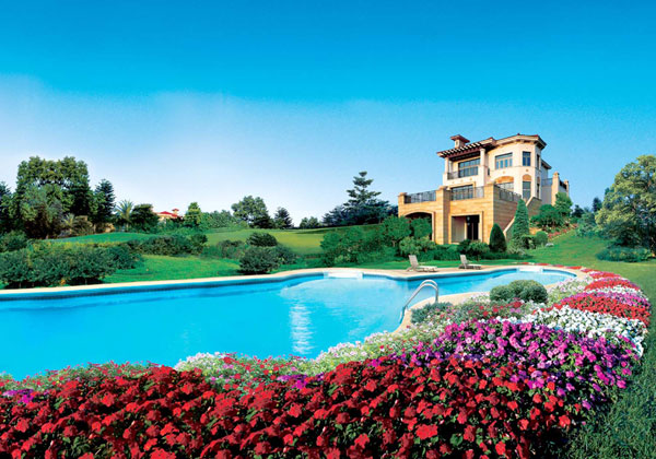 观澜湖高尔夫大宅被迷人的高尔夫球场紧紧环绕,郁郁葱葱,独享1000㎡的私属花园,前庭后院自成院落,最大花园面积达近2000㎡。独特的院落设计,引景入室,别院、球场自成一体,坐享最佳景观视角。