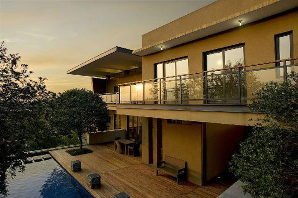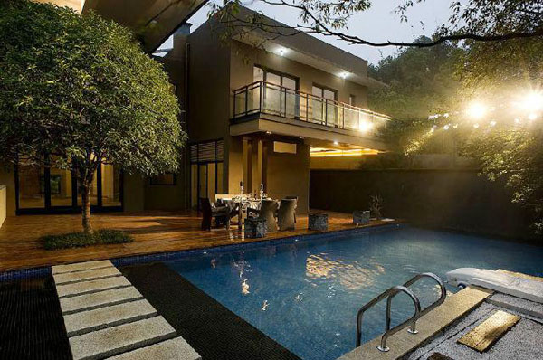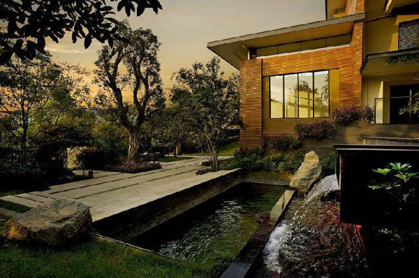 栋别墅处,景观设计方案巧妙地运用挡墙做了一轮满月,配以苍劲罗汉松,自成一幅“明月松间照”的画意幽境。而在表现方式上,却是运用现代材料,嵌入发光带等方式立体呈现出现代园林。