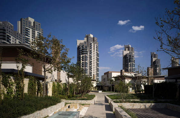 “CORSO”步道如同一条纽带,联系着北面的居住组团,南侧的高层区和低层别墅区,于是混合的规划格局得以形成。“CORSO”两侧的建筑控制在2层至4层,形成人性化的尺度,以及丰富且具有生活气息的城市街道氛围。整个街道两侧建筑的距离被控制在18m的宜人尺度,拉近了两侧商业的互动和人群的交流。