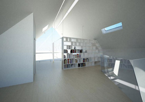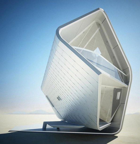 建筑不规则卷曲的结构由轻量的碳化纤维桁架支撑,外部固定覆盖层反射强烈光线。房屋两侧的透明的玻璃面板根据太阳角度的不同自动改变透明度,调节室内温度。弯曲的屋顶构件在下方则转变成一个平整的入口庭院。室内空间开放,可利用窗帘自由划分空间。