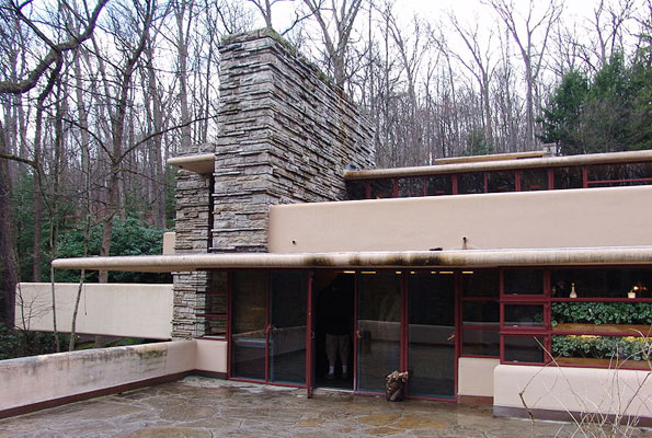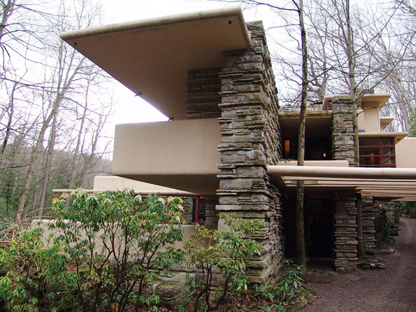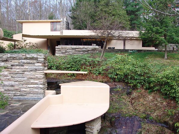 莱特对自然光线的巧妙掌握,使内部空间仿佛充满了盎然生机,光线流动于起居的东、南、西三侧,最明亮的部分光线从天窗泻下,一直通往建筑物下方溪流崖隘的楼梯,东、西、北侧几呈围合状的室,则相形之下较暗,岩石铺成的地板上,隐约出现它们的倒影,流瀑在起居室空间之中,而从北侧及山崖上反射在楼梯上的光线显得朦胧柔美。在心理上,这个起居室空间的气氛,随着光线的明度变化,而显现多样的风采。