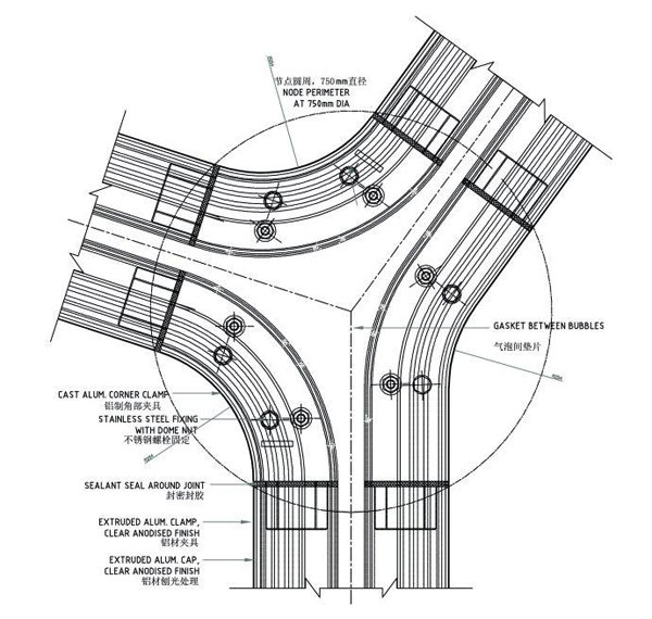 这里的新材料是与传统材料相对的一个广义的概念,可能这种材料在科学实验室中早就被发明出来,并且在其他领域有了大量的应用,但考虑到其持久性、经济性、可批量生产性、可建筑性等各方面原因而并未在大型建筑领域被批量使用。然而,一旦这种材料被使用到大型公建上时,其物理属性将在功能引导上得到异常放大的非常规效应,同时其表现力也将是戏剧化与宏观视觉震撼的协同效果。在如今建筑内部结构成熟度相对较高的条件下,在大型公共建筑上使用新材料表皮,并且以迎合材料意志的模式创造表皮与结构界面或连接部位,是体现设计价值的最直接途径之一。