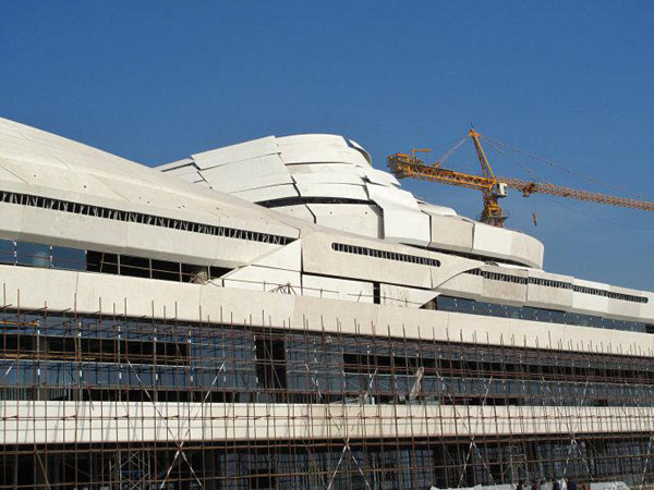 天津国际邮轮母港客运中心在其屋顶及外墙上使用了大面积的GRC材料(玻璃纤维增强水泥),这种材料是将二氧化锆(ZrO2)加入玻璃原料中使玻纤成为抗酸、抗碱侵蚀的超强纤维,并以水泥及砂为胶凝及集料,通过机械喷射、预混、铺网抹浆、混合等工法成型的一种高强度抗老化的复合材料,选择GRC是出于对建筑形态实现及作为海港建筑耐候性的双重考虑。建筑形态上,“海”与“丝绸”这两者形态上所拥有的共同点让这座港口的建筑师非常着迷——连绵无尽的起伏,光影于其上的变幻莫测显得幽雅而柔美,这种形态里找不到横平竖直,找不到标准化的构形单元,这是一种属于自然的构形逻辑,对于一座邮轮码头来说更是具有良好的象征意义,但这样的形态设计却给实现它的过程带来了挑战。同时,考虑到项目位于海边,存在腐蚀性及耐候性的问题,设计师因此放弃了同样拥有良好可塑性的传统金属幕墙方案,从而转向了水泥制品表皮。设计师曾考虑过全混凝土现浇,然而混凝土荷载大,温度变形大,工艺复杂,施工慢,也不具备实现这座码头的条件。最终经过反复推敲,设计师选择了GRC作为本项目的主要外墙及屋顶面板材料:充分利用了GRC材料的抗腐蚀性以应对海风的侵袭,并利用其优秀的抗弯、抗剪、抗拉能力(普通混凝土的5倍)以应对海边巨大的风压;更重要的是这种材料的生产方式非常的自由,具有很强的工艺化特点,可以做出各种形状的造型,生动地实现了“海上丝绸”的建筑形态及创作寓意。