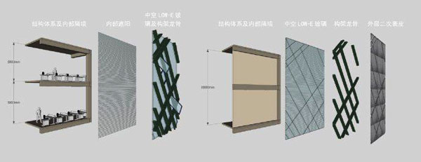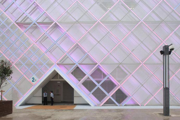 最后举一个运用材质叠加技法的项目:上海世博会国家电网馆。众所周知的是,世博会的展馆建筑更多地是单一的展览功能单体,由于其功能的单一性导致其内部结构并不是每个展馆想要展示的重点,设计师在构思世博展馆的时候无不把表现力寄托在表皮的设计上,国家电网馆在表皮设计上也是遵循了这样的目的。说到国家电网给人的第一印象就是遍布祖国各地的高架铁塔,正是有了这些铁塔才能将源源不断的电能从各个发电站输送到了千家万户。因此建筑的立面设计采用了斜向交叉网格的形式,这种斜交叉的网格形式与高架铁塔的斜交叉钢架一脉相承,使人们看到场馆就能感受到电网所传递的能量与信息,这样一来场馆就具有了电网特有的企业形象和特征。建筑立面采用玻璃及穿孔铝板的双层幕墙体系及部分聚碳酸脂板,几种完全不同的材料充分的结合在一起,所有这些材料都是可回收再利用的。既可满足建筑外立面整体感的需要,也可满足部分房间自然采光的要求。作为围护体系的隐框玻璃幕墙,其分隔沿网格形状设置,并对单一的网格大小进行细分,局部加以错位,形成一定的韵律感。在玻璃幕墙的外侧设置铝合金穿孔板,形成双重表皮的体系。可见该项目通过各层透明处理、层内韵律感表达、层间对应性强调等一系列不可或缺的组合手法成功诠释了一种第三维的材质拼贴效果,也就是我们所说的材质的叠合。