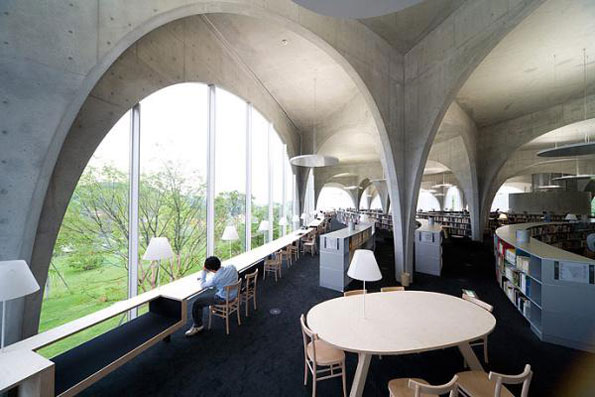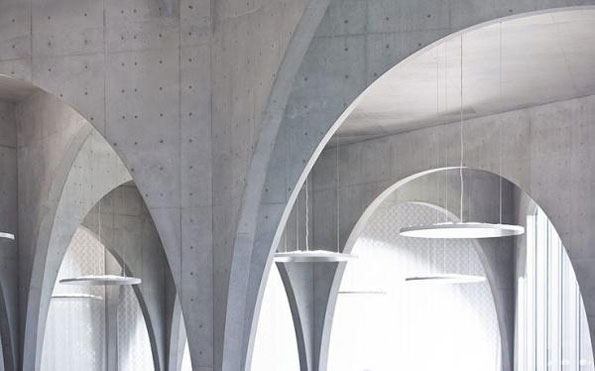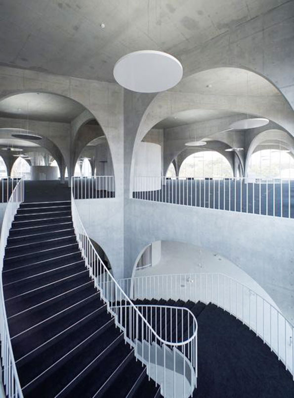 从结构上来看她就像是现代版的哥特式建筑。相互交汇的拱形结构是整幢楼的主要支撑,钢架外裹清水混凝土的处理使这些拱形显得格外纤薄。建筑的功能在某种程度上是开放的。虽然拱形结构分割出的各个区域,仍然可以让使用者自由定义。穿梭在门洞之间的大玻璃,学习桌,沙发和呈弧形的书架呼应了建筑内部空间的连续性。