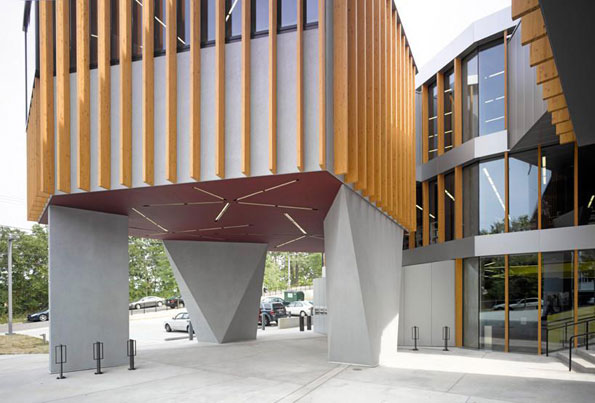 室内墙面选用了多种木材面板,让室外的林地环境自然的融入到建筑内部。