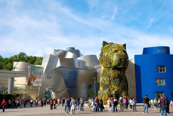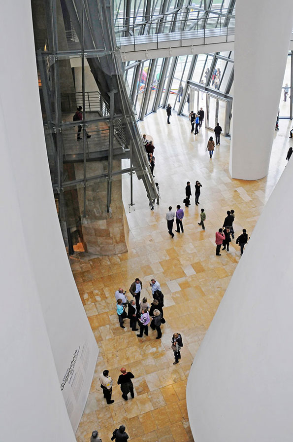 在此中庭下,人们被调动起全部参与艺术狂欢的心理准备,踏上与庸常经验告别的渡口。有鉴于赖特在纽约古根海姆博物馆设计中对艺术展品不够尊重的教训,盖里的展厅设计简洁静素,为艺术品创造一个安逸的栖所。