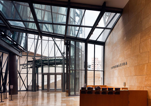 博物馆的室内设计极为精彩,尤其是入口处的中庭设计,被盖里称为“将帽子扔向空中的一声欢呼”,它创造出以往任何高直空间都不具备的、打破简单几何秩序性的强悍冲击力,曲面层叠起伏、奔涌向上,光影倾泻而下,直透人心,使人目不暇给,百不能指其一。