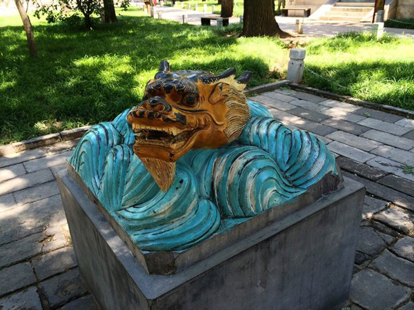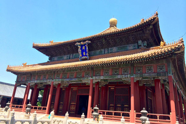 国子监辟雍是国子监的中心建筑,建于中轴线中心一座圆形水池中央的四方高 台上,是一座方型重檐攒尖顶殿宇。四面开门,设台阶六级。辟雍周围环绕著长廊,四面架设精致的小桥横跨水池使殿宇与院落相通,这种建筑形制象征着天圆地方。