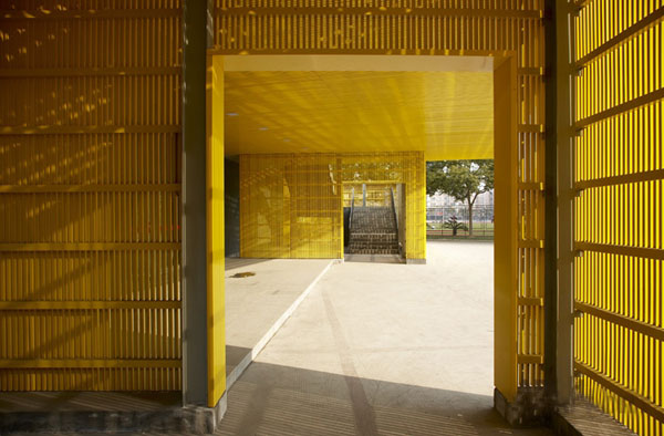 3. 在体育馆入口上方增加两个盒子,将空调室外机隐藏起来,并且使之成为入口的雨罩。利用同样的手法在训练馆附属建筑外侧增加金属格栅,并将其设计成两个错动的盒子,这样即遮蔽了空调室外机,又为南侧的入口增加了一个雨罩。另外还用金属格栅将训练馆的两个室外楼梯和二层入口包成三个大盒子。