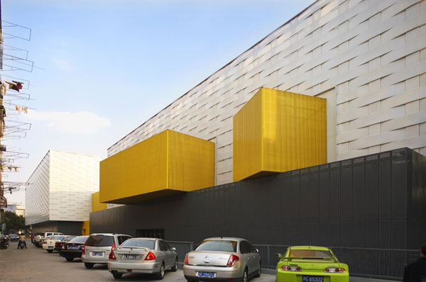 建筑在白天使用时以自然采光为主,因此在上部立面改造时我们希望找到一种材料,他应该质量轻、强度大,对采光影响不大。最后我们采用了乳白色实心聚碳酸酯板,并且使用了编织的方法将其固定在后面的钢架上。本工程建成后,使这一地区的城市面貌发生了很大变化,同时她已经成为上海市青浦区一处深受市民欢迎的体育健身场所