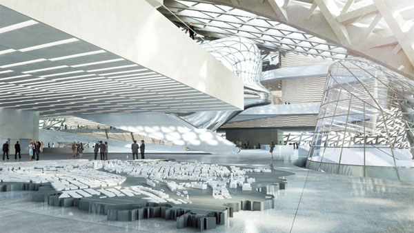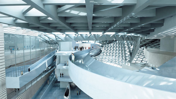 福田文化中心内各个建筑之间的空间联系在博物馆综合体建成后更和谐了,与书城、图书馆和剧院一样,它把博物馆的主空间设在距地面10m高的层面上。这个台 面为游客提供了一个很好的视野平台,把游客定位在距地面10m的高度上——这个处理与前面所提的建筑一致。这个高度也使得博物馆和少年宫将来可以通过一道 宽面桥相连通——既是交通联系,也是逻辑意义上的联系。 这些构想完善了城市规划区域的东翼,也与已有少年宫的几何关系相和谐,完满解读了所有已有建筑的环境与该建筑的关系。