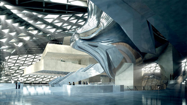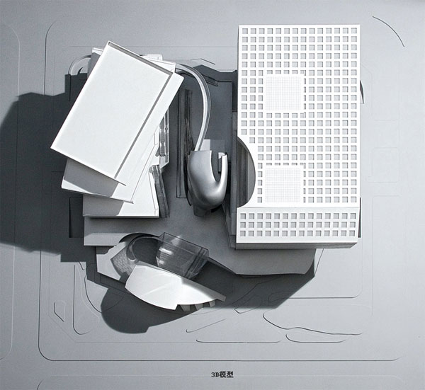 雕塑体在形式上把两个馆联系起来。建筑的形式生成于功能空间与立面表皮的融合,垂直交通空间由“花”、公共广场和底座所组成。雕塑体具有动感韵律的表皮, 是对周围城市环境的反应,是向福田文化区域的方向旋转生成的。这个旋转形成了一个新的入口,指向福田中心区域的中轴线,并且暗示了主要交通流线的位置。这 个设计的概念是在建筑内压以及城市对建筑的外压下,挤压出一个富有动感的构造物——一个步行尺度的“雕塑体”