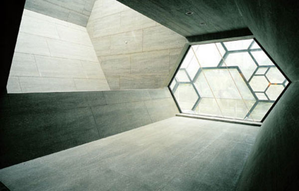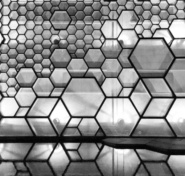 展馆的室内设计再次运用立面所含有的六边形元素作为基本平面形态,在进深方向上作拉伸,形成一系列折叠平面互相交叉、互相 切入构成的复杂但带着明确功能元 素的公共空间。这种表达形式改变了原本单调的立面几何图案,用三维方式生成新的室内空间,这种“突变”形式使设计产生了不可预料的惊喜结果。