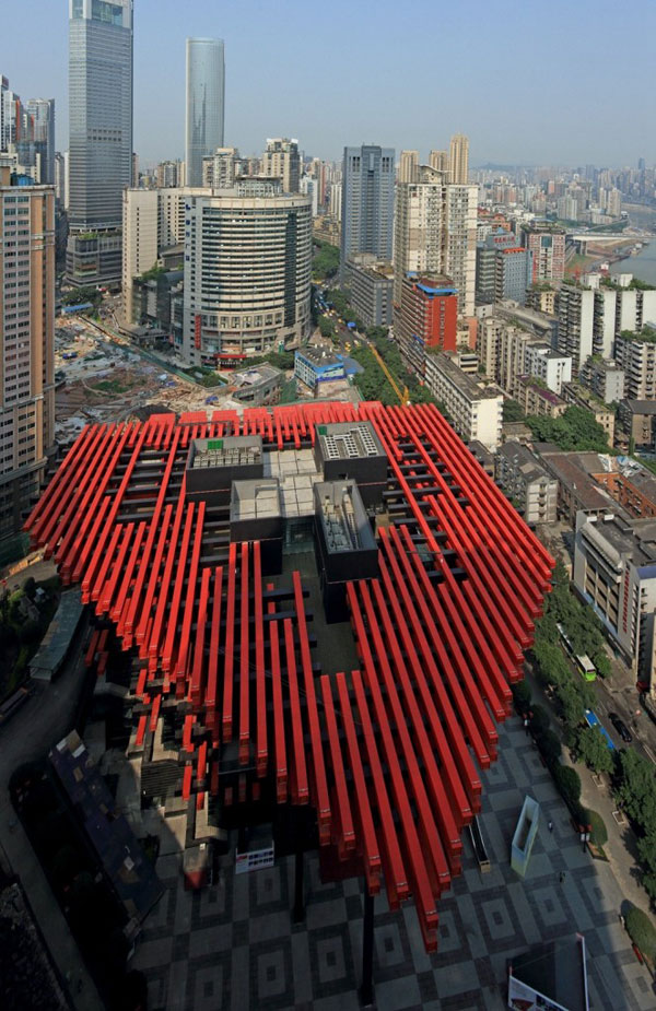 艺术中心的大楼主体为红色,象一团燃烧的“篝火”,也象一艘起航的舰。 作为为标志性建筑对其他地块形成统领作用.既统一于解放碑地区现有建筑,又为解放碑地区创造了新的秩序。国泰艺术中心及其森林广场与洪崖洞项目相连,直抵嘉陵江,给解放碑打开一个呼吸的窗口。国泰大戏院在色彩方面具有地域性及鲜明的特征,在林立高楼之间,露出红色的边角,带给人们方向感和归属感。结合自身建筑功能的复杂性,创造一个与外部城市空间相互渗透融合的具有东方 特质的肌理。