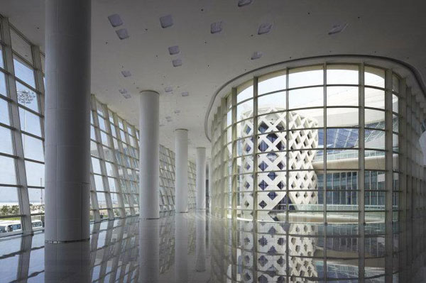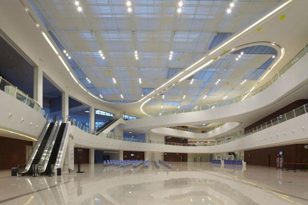 客运大厦已经“飘动”在了天津东疆港的最南端,目前看来有点孤单,周边还是一片荒芜,规划似乎仍在调整之中。突然想起当初最开始做方案的时候,我们曾被告知有“一期”和“二期”两部分,所以从鸟瞰效果图上仍能看到我们所设计的“二期”那一部分,并且还被告知会有城市轻轨与客运大厦接驳,于是我们还煞费苦心的在“一期”的东边设计了现在可以看到的向北面伸出的端部,想把轻轨直接引进建筑物内部,并想将“一期”与“二期”之间的空地留为公众可以穿越的景观通道。不过这些都随着规划的不断调整而成为过眼云烟,唯一没变的就是当时中标后由天津市领导拍板定下的形式,所以那端部虽已不再有接驳轻轨的功能,但还是保留了下来。