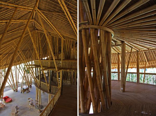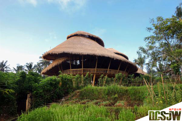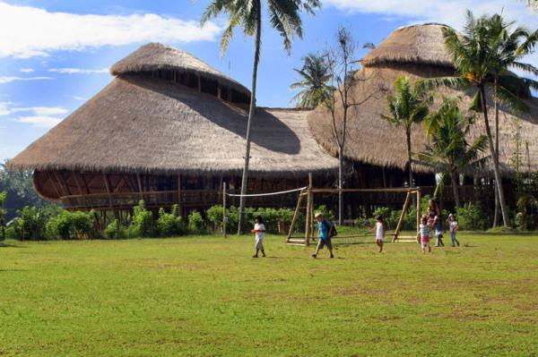 在印度尼西亚相遇的john hardy和他的妻子cynthia计划兴建一座“green school”,这是一个建在巴厘岛森林和稻田里的教育乡村社区,通过一种为当地人服务的教育系统来传播他们无私的,可持续的思想。他们请巴厘岛公司PT bamboo pure来负责整个竹子建筑的技术设计。当地丰富的亚洲木材具有多种利用潜能,它们可以作为结构、装饰材料,用于制作地板、座椅、桌子和其它器具。建筑师通过组装各部分构件的方式来建造整个建筑物,将当地的传统建筑形式与当代设计有机融合。