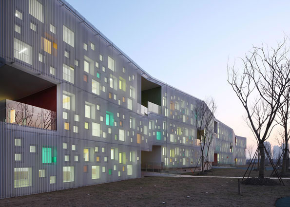 中庭可以为孩子们提供日常生活体验不到的情感的和娱乐的空间体验。除了作为交通空间的功能以外,中庭的模糊性和不确定性也为空间的使用提供了更多的可能性。建筑的外部形式和立面都反映出同内部的必然联系。这栋建筑除了两个相互分离的体量,不同楼层不断变化的高度也被明显地反映在立面上。