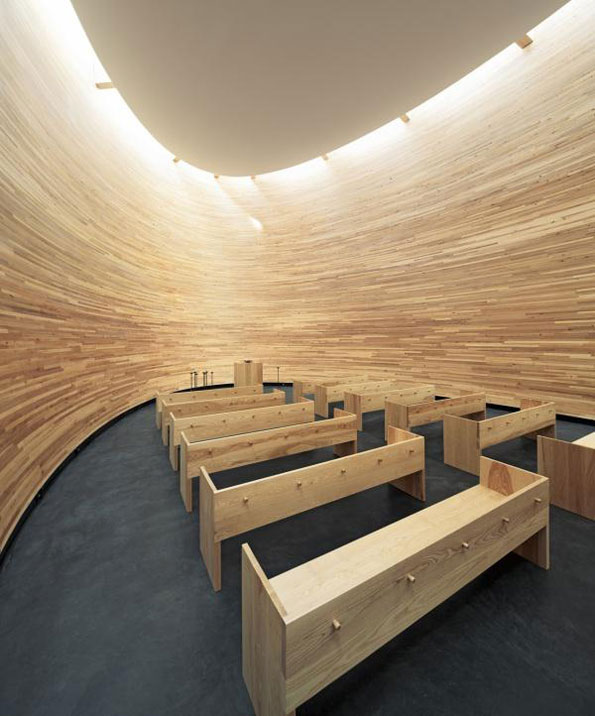 相对于周围生动活跃的社区来说,Kamppi教堂是一个静谧的场所,光线倾泻在弯曲的表面上,温和的材料限定出空间。教堂的内墙是厚油桤木木板,家具用了实木,外立面由交叉隼槽的云杉木材拼合而成,表面涂以透明纳米蜡,结构框架则采用CNC数控机床切割。