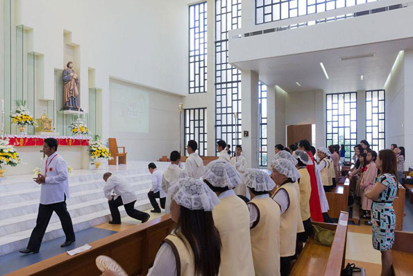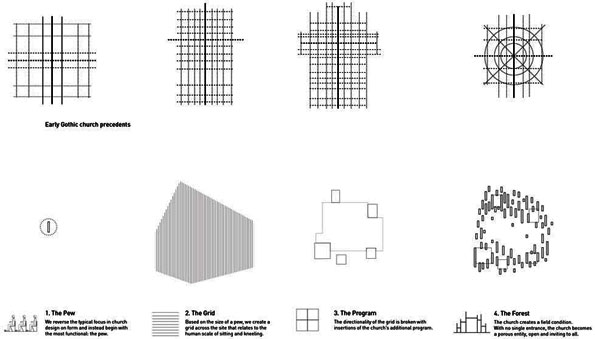 墙体在网格布局中排列,中心大空间是排满座椅的礼拜堂