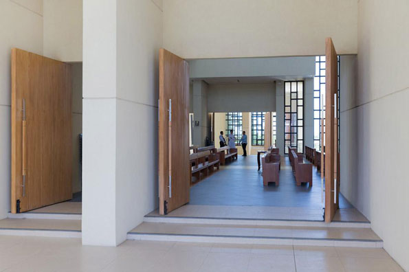 所有的墙面都沿一个方向排布,这样建筑就拥有一个完全不透明的石墙立面和另外一个完全通透的立面,两者之间,光明与黑暗交替。墙体在网格布局中排列,中心大空间是排满座椅的礼拜堂。在这里,光线通过林立的到达石墙渗透而入,空间光阴变化无穷,充满神圣性。为人们实现“短暂的停留”却仿佛“通向永恒”的体验。