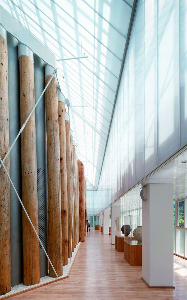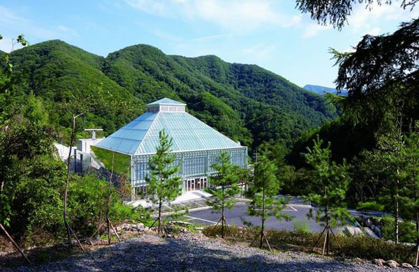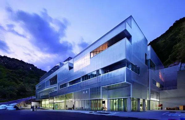 这个项目最吸引眼球的地方应该是其中央大厅给人带来的万丈光芒的感受,而其外部看上去其实相当的平淡无奇。为了让建筑尽量在这样一个山地林区 内显得不那么突兀张扬,建筑的外形尽量希望融入到环境中。于是我们看到了外立面穿了一身玻璃的外衣,建筑师希望建筑能够反射周边环境达到融入其中的目的, 但是手法略显拙略,与贝聿铭的卢浮宫金字塔不可同日而语。