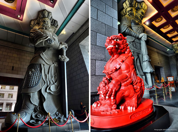 四天王为守护佛法的神明,分别是『东方持国天王』、『南方增长天王』、『西方广目天王』及『北方多闻天王』,神像手中分别拿著象征风调、雨顺、国泰、民安的法器;四天王殿为中台禅寺主体的殿堂,『弥勒菩萨』供奉于殿堂中央,弥勒菩萨的背後有身著甲胄、合掌擎剑的『韦驮菩萨』,而四大天王像则分镇在殿堂四周,神像皆以山西黑花岗雕制;四天王像高度约12公尺,重达100多吨,每尊天王皆有四面头像,象征一即四、四即一,四天王的金刚严肃的眼神令人为之震撼。