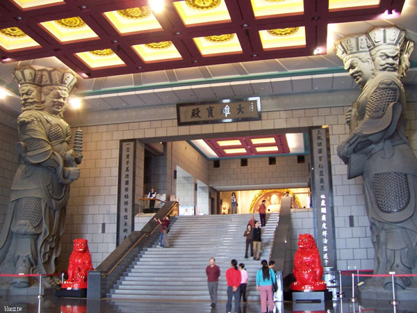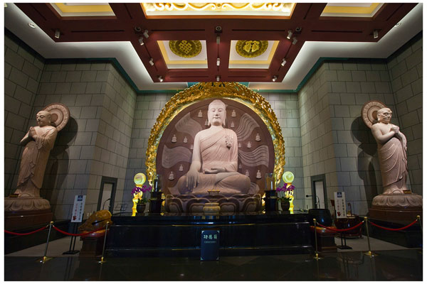 中台禅寺的大雄宝殿位于主体建筑的二楼,从四天王殿直上阶梯即可到达,大雄宝殿即是佛教丛林道场中供奉佛像的正殿,一尊由印度红花岗岩雕琢而成的释迦牟尼佛镇坐于殿堂中央,佛具大智力,能降服魔怨、威德高尚,故称“大雄”。大雄宝殿整体的空间设计以红、灰为主色,象征佛陀现身于五浊恶世普度众生的时间景色。侍立两旁的多闻阿难尊者与苦行迦叶尊者代表著修行的精神。
