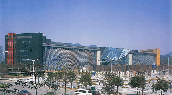该方案的宗旨是要把深圳文化中心建设成为深圳中心区这个大剧场中的一个重要舞台。由深圳中心图书馆和深圳音乐厅构成的统一整体,形成了一个面向宽广的中央绿化带的开放空间。在这里,市民可以自由自在地从事各种文化娱乐活动。