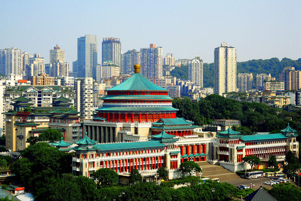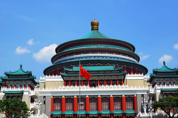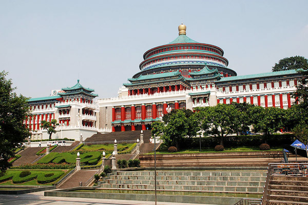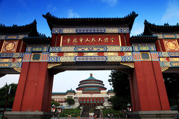 主体部分的穹庐金顶,脱胎于北京天坛的皇穹宇,仿天坛有祷祝“国泰民安”之意。;正中的圆柱望楼,是北京天安门的缩影;南北两翼,镶嵌着类似北京紫禁城四角的塔楼,一色绿色琉璃瓦顶,大红廊柱,淤塞栏杆;广袤的庭院中,前阶宽阔平展,梯次六重;大门为一大牌坊。整个建筑布局合谐,雄伟壮观,雕梁画栋,金碧辉煌。1997年,重庆设立直辖市,大礼堂前改建为有草坪与喷泉的人民广场,成为供游人参观、休息和举办节庆集会的重要景点和场所。