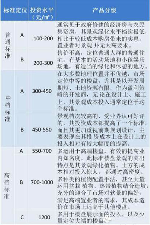 1.景观投资水平应根据营销定位的楼盘档次相匹配,可参照同档次楼盘的景观投入水平。