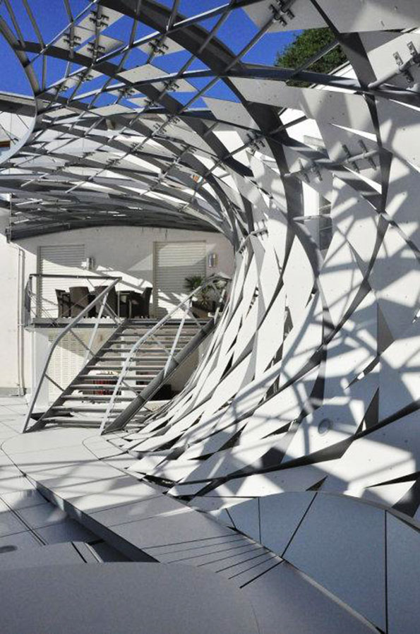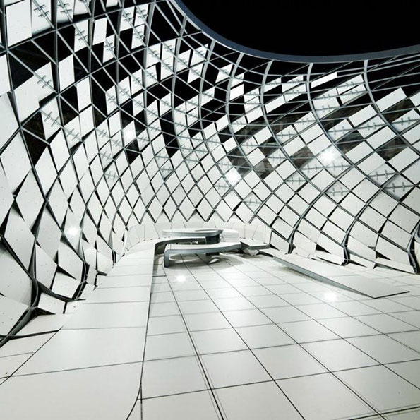 钢斜肋构架结构上断断续续的覆盖了一层弯曲的长方形金属板。这种表皮形式逐渐消隐,好像一直垂直的移动到建筑物顶端,使内部空间与天空距离更近。