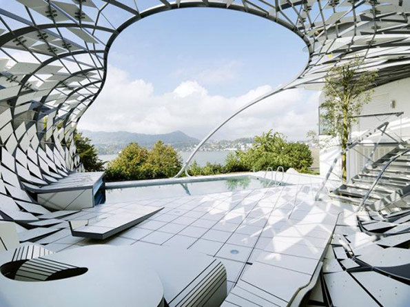 “景观围栏”是一座可以俯瞰景观湖泊的住宅建筑,位于奥地利,由维也纳建筑事务所heri&salli设计。建筑师将链条式围栏的概念转化成一种美学元素,将这座住宅完全包裹住,在保证住户私密性的同时,还让他们能直接观赏到室外的自然美景。位于户外游泳池和露台之上的是弧线形跨越式的顶盖,这个原本用于划分空间界限的结构体并没有为人们带来宽阔的空间感,而是变成一个消隐了的屏障。对角线形的图案从屋顶一直包裹到地面,与楼梯、座椅、桌子融合到一起,形成了一体化的流动空间形态。