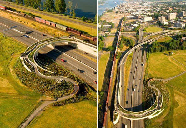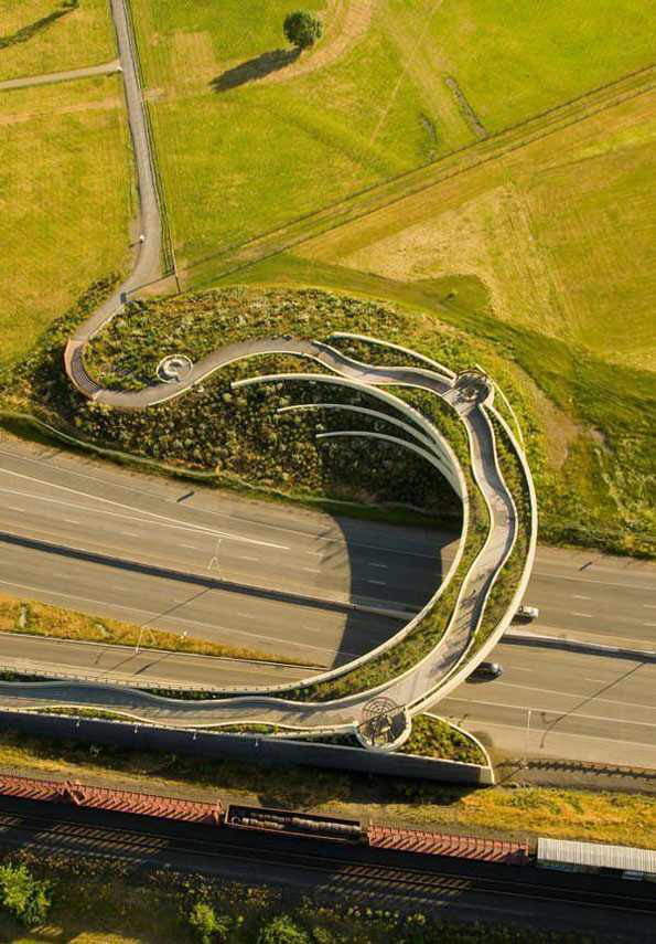 在美国华盛顿州,14号公路阻断了具有历史纪念意义的温哥华堡和毗邻的哥伦比亚河滨,温哥华堡国家公园管理处原本想建个简单安全的钢筋水泥跨路通道纪念一下1804年–1806年的刘易斯与克拉克远征,没想到Jones & Jones’s建筑事务所和当地艺术家合作,为大家奉献了这座号称世界上最美的天桥——the Vancouver Land Bridge。