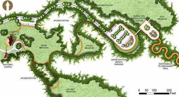 图07:拟建的帕图森特河流绿道的一个焦点区。这个绿道方案以保护历史古迹为导向,同时还包括重新造林、提高河流、停车场和次级步道系统的可达性,以满足不同游客的需求。Photo Credit: John Lightle