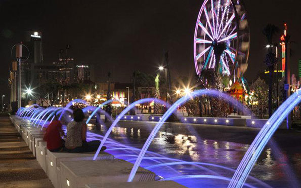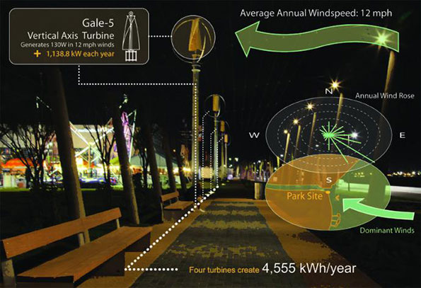 公园沿滨水区包括了35英尺高的风力发电机,将产生能源并输回输电网。风力发电机同时也是一种动态艺术形式,其雕塑感的特质源于海螺的外形和色彩,表现了城市独特的海湾环境。风力发电机将作为滨水区标志性的地标,并为公园提供可再生能源。风力发电的引入也通过对潜在危害性大风的利用建立了文化和历史上的联系。