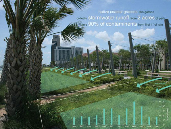 公园位于飓风后建造的防波堤背面的填海材料之上。基地的雨水被引入栽种着本土沿海草地植物的线形雨水花园中,过滤雨洪污染物,让径流渗入地下。沿海的草地提醒着游客大堤建造之前的沿海景观,提供了关于海湾本土景观生态环境的教育。