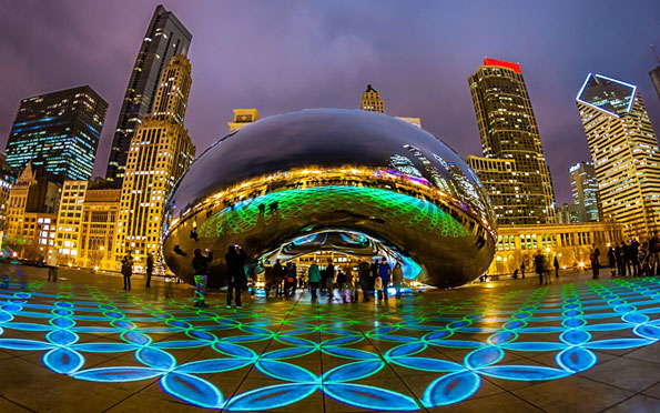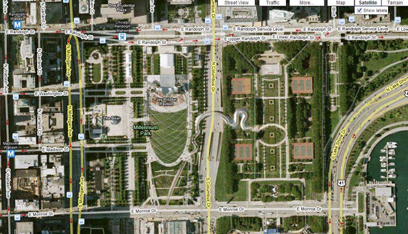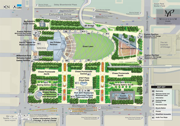 千禧公园的一边是繁华的芝加哥市中心,包括世界第三高的希尔斯大厦(SearsTower)等摩天大楼和闻名全球的芝加哥期货交易所(CBOT)就坐落在这里。另一边则是风景秀丽的密歇根湖,不同颜色的帆船把湛蓝、平静的湖面点缀得如诗如画。公园内的巨大人工喷泉把银白色的水柱射向百多米的天空,颇为壮观;水雾落下时形成的七色彩虹和摩天大楼相互衬托,形成柔刚并存的巨幅彩色画卷。