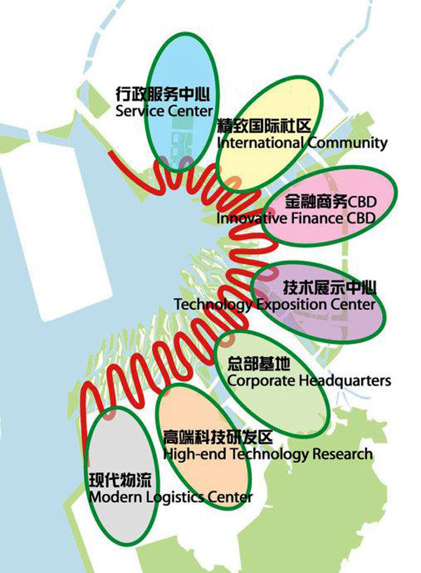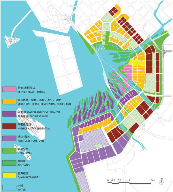 7号方案为前海地区构想了一个充满活力的二十一世纪新水城,这个新城密集紧凑,丰富多样,遵循可持续的原则,并环抱着这个城市最重要的资源之一——水。而6号方案提出的设计策略给前海湾赋予了创造性的优美形式,前海将成为珠三角地区的重要节点和独一无二的亚洲城市港湾。8号方案用分层和环带的方式提出核心策略,以一个直径3.4公里的环带界定前海,该环带包括快速路、空中轨道交通和绿化带三层,并包含一个广阔而连续的公园。