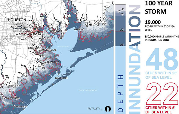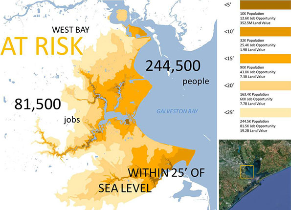 Galveston Bay's funneling geometry places the communities of West Bay in harm's way; 244,500 people and 81,500 jobs exist within the 25' contour.244500人和8万个工作机会都在25年风暴警戒区内。