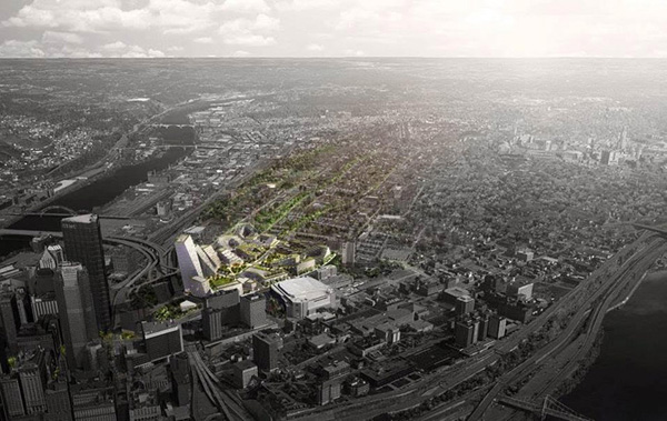 BIG与West 8 以及 Atelier Ten联手在匹兹堡下丘区一块28英亩的用地上打造了一个跨越场地地形的无障碍城市规划区,这个区域包含了1200个住房单位,一万平方米的商业区,以及 一个充满活力的城市开放空间。这次规划乃是对10年前规划的重新调整和开发,新增的公共区域能够极好的联系各个区域和城市。