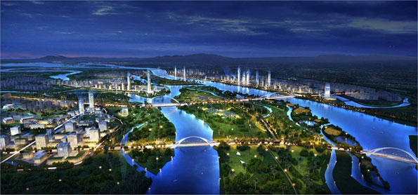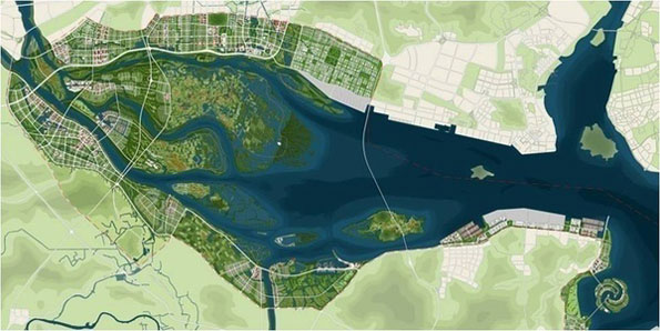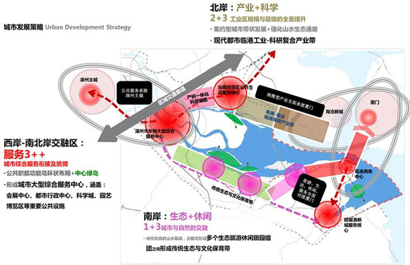 本次城市设计以创造“植根本地特色的全球化引力”为核心目标,利用区域资源,实现漳州与厦门大都市区域动力机制的三岸对接;利用地方性的生态资源和生活品质,围绕土地空间集聚的内陆发展模式,实现向拥抱河流、岛屿、田园的智慧田园滨水生活模式转变;利用岛屿的巨大力量,建设生态田园基底中的智慧共生岛屿聚落;按照中国现代山水人居生活模式,塑造现代中国山水人居梦想;利用个体组团的有效资源,塑造江海之间的五个复合型水城——智慧产业、优美地景、面海生活充分融合的都市岛群。