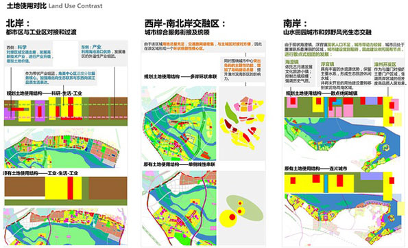 漳州滨海新区北岸重点发展产业,建设带状山水城市,强调集约复合;南岸为精品休闲区,形成点状田园城镇,强调生态交融;南北岸交融区利用城市交通入口优势和生态岛群优势,以系列公共职能功能岛环抱沙洲岛中央公园布局,强调多岸缝合。以生态敏感性研究为前提,城市建设指标与总规持平,减少南岸城市建设用地,城与岛隔岸成组发展,建立城市岛和生态岛相结合的都市岛群。