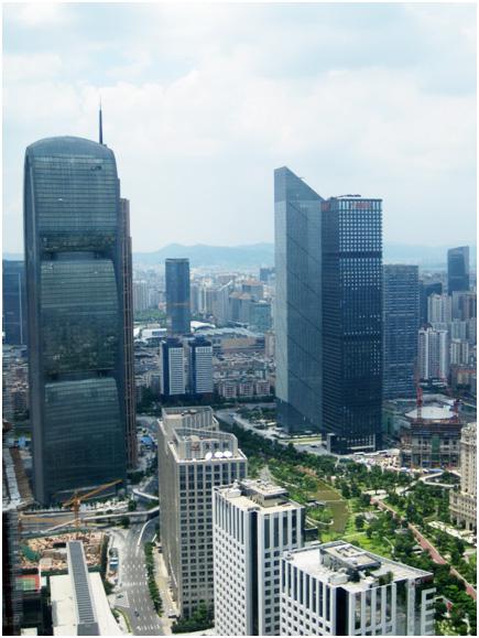 珠江新城南端是4个文化建筑,规模虽大,但不高耸。中段的IFC贴近轴线且最高。北段的超高层写字楼区域离轴线近建筑则矮,离轴线远建筑则高。明显的高低错落天际线富有层次,并且每栋建筑都能有看到轴线的视线通道。